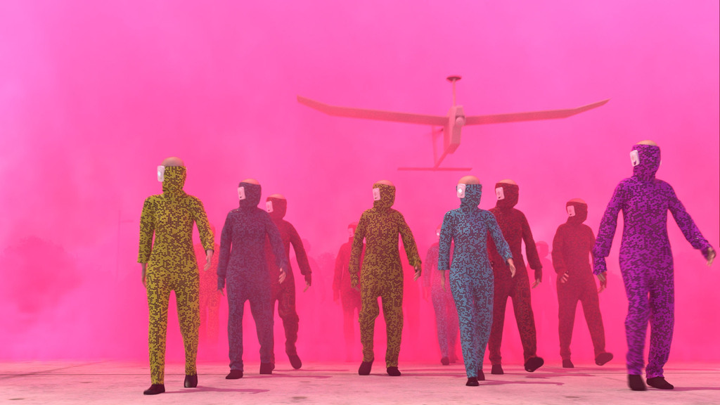 The Hong Kong riots are evoked, by the use of umbrellas to thwart facial recognition cameras.